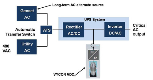 Figure 1 shows a simplified block diagram of an Uninterruptible Power Supply (UPS) that uses the VDC for continuous power conditioning and power source backup. In the event of a loss of line input from the utility grid, the VDC immediately goes into discharge mode, maintaining the DC bus of the UPS to support  the critical loads with no interruption. Upon restoration of input power by a generator set (genset) or recovery of the utility, the VDC recharges to full operating energy and awaits the next event. The VDC can be used in a variety of applications including backup power during genset ride-through, “battery hardening,” load-leveling for standby gas turbines and continuous power conditioning.