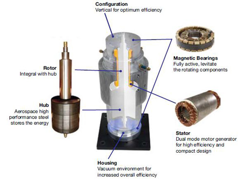 ? The flywheel module, which includes the high strength steel hub (flywheel rotor), high speed permanent magnet motor/generator and a five axis active magnetic bearing system.